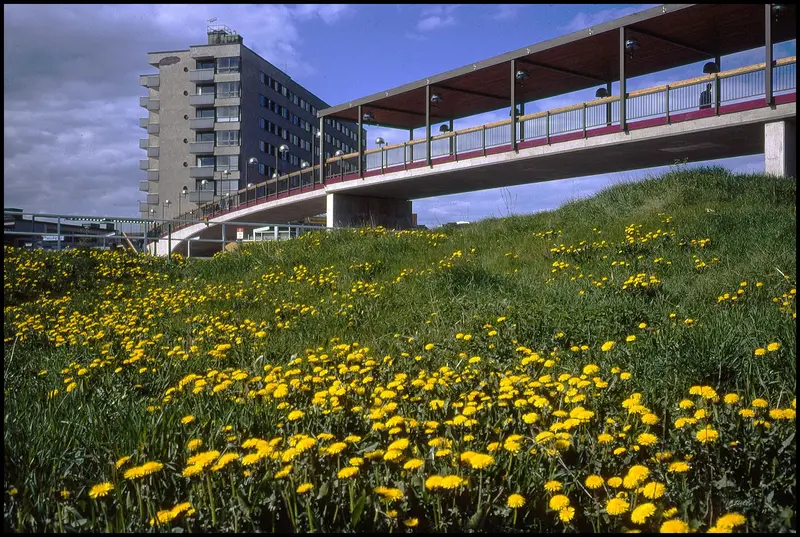 En bild från 1975 i slänten nedanför dåvarande Domus. Fotografen Lars Ternblad berättar historien bakom bilden. Man ser gångbron som gick från kommunhuset till Domus.