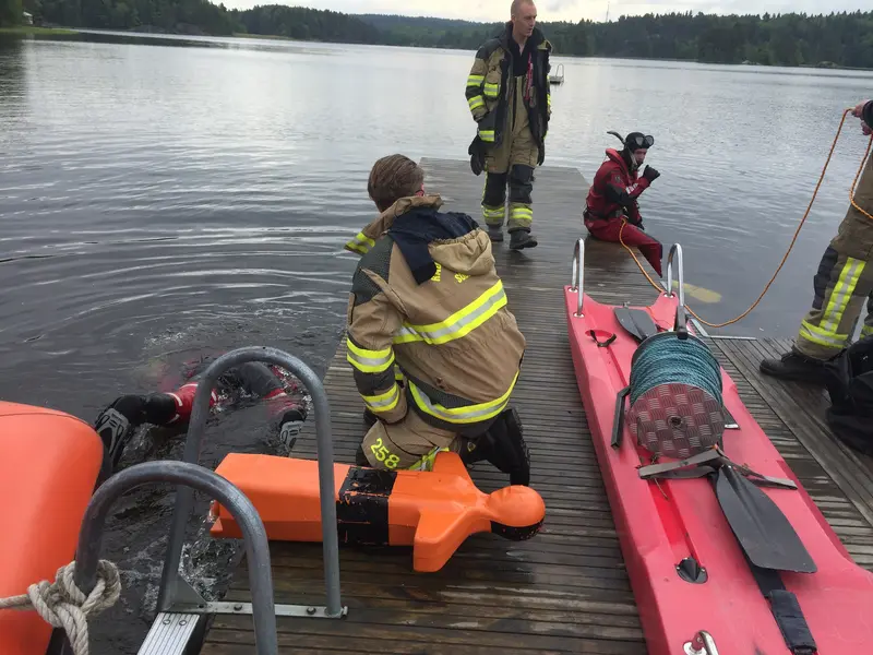 Tyresö brandstation med styrkeledare Björn Vigström i spetsen tränar livräddning vid Albysjön. Björn och brandmännen berättar för Ann Sandin-Lindgren vad man ska tänka på i sommar när det gäller att släcka bränder, rädda liv och förebygga fara.
