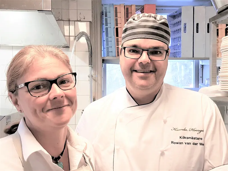 Kicki Keller och Rowan van der Merwe berättar för Gunnel Agrell Lundgren om sin mångfasetterade verksamhet i restaurangen på Kumla Herrgård. Förutom dagens lunch som avnjuts i den vackra salongen med linnedukar och friska blommor har man fester och evenemang av olika slag. Även forna tiders invånare på gården "hjälper till" ibland.