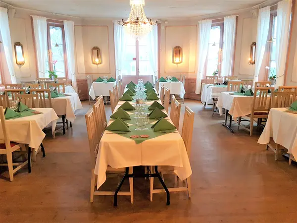 Den eleganta salongen, där man alltid äter på linnedukar och har friska blommor på bordet.