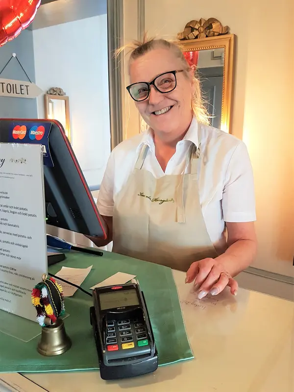 Lena tar emot gästerna vid kassan.
