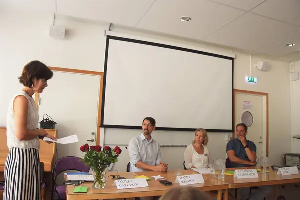Från vänster: Moderator Ingela Carlsson,David Westius gymnasielärare (s), Katharina Sparrwardt lärarförbundet Tyresö och Daniel Färm, chef tankesmedjan Tiden.
