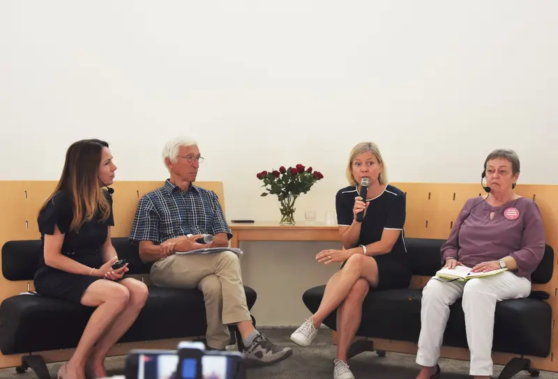 Moderator Anita Mattsson(s), Bo Toresson PRO Tyresö, finansminister Magdalena Andersson och Christina Tallberg ordförande PRO Sverige.