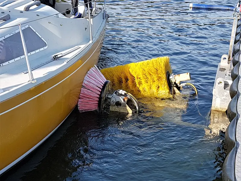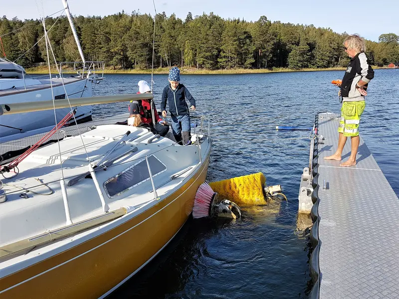 Här ser man de roterande borstarna, som tvättar botten och även en bit ovan vattenlinjen.