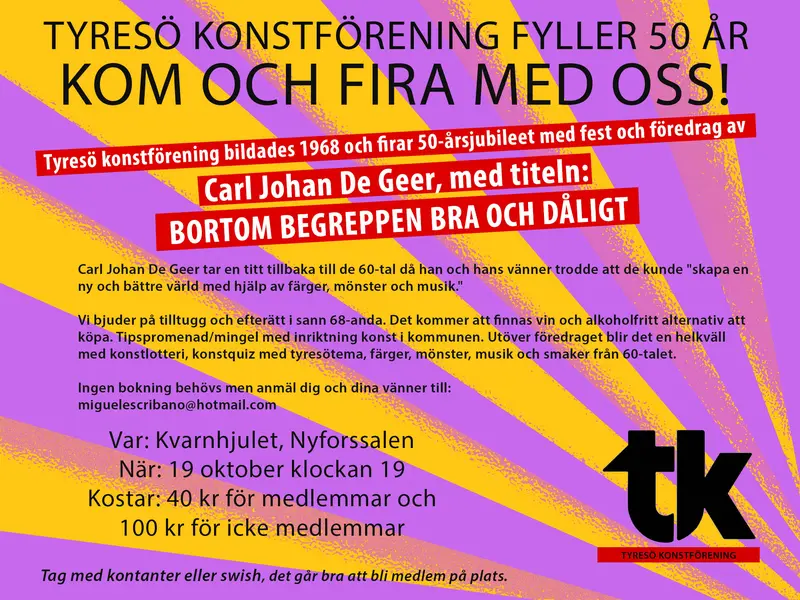 Det bjuds på föredrag av Carl Johan de Geer som reder ut begreppen bra och dålig konst Inträdet är 40 kr för medlemmar och 100 kr för övriga. För detta får man en lott och viss förplägnad. Tid 19 okt kl 19.00 Plats Kvarnhjulet, Nyforssalen