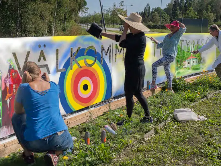 Gunilla Iversen, Lisa Malmgren och Sofia Toborg som representerar Konstrundan här i Tyresö samtalar med Leif Bratt om kulturevenemanget som börjar med en veckoutställning i Bollmoradalens kyrka den 11 nov och avslutas med själva rundan helgen 17-18 nov.