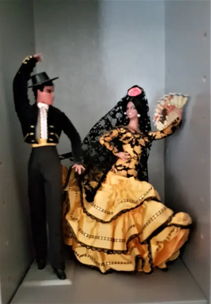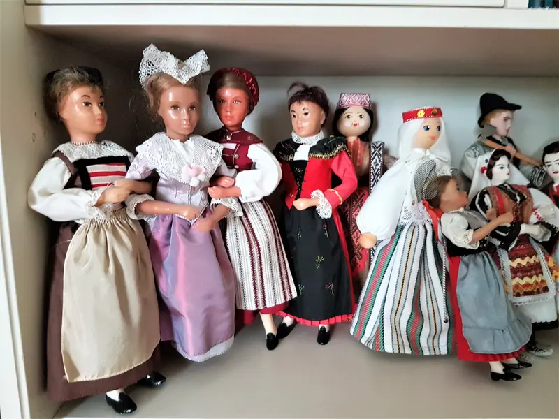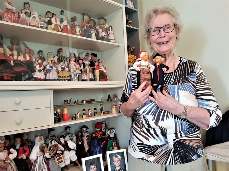 Ulla med några av sina dockor. Dockorna hon har i handen bär hennes och Svens folkdräkter.