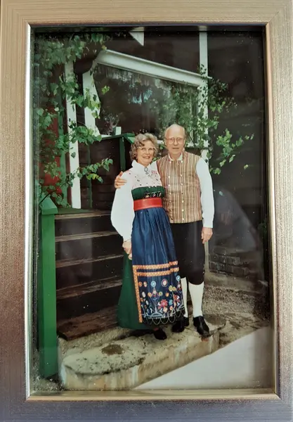 Ulla och Sven i folkdräkter utanför sin soltäppa