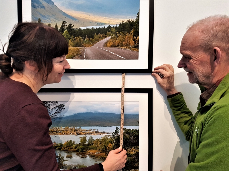 Kom och möt de 4 konstnärerna Marina Adolfson, Bo Frössling, Annika Jernström och Rolf Hagström i livligt samspråk inför utställningen NATUR-LIKT i Konsthallen i Tyresö C, 2 feb-2 mars. Vernissage lördagen den 2 feb kl 12-15. På bilden hjälps Rolf Hagström och Charlotte Gyllner åt att hänga konsten. Programmakare Gunnel Agrell Lundgren.