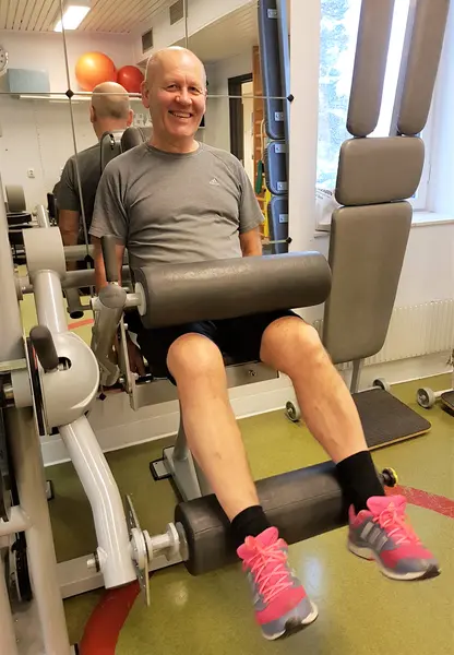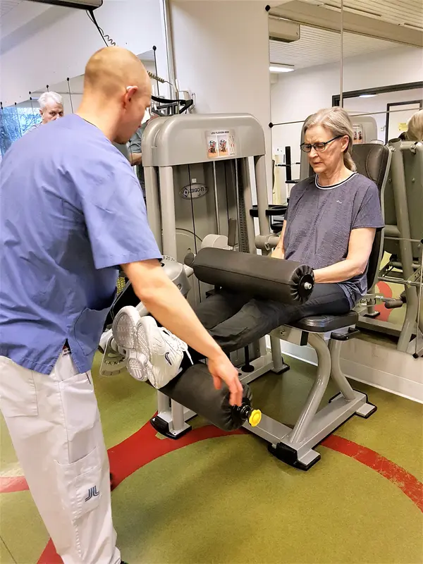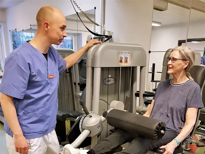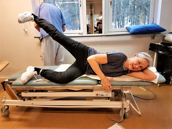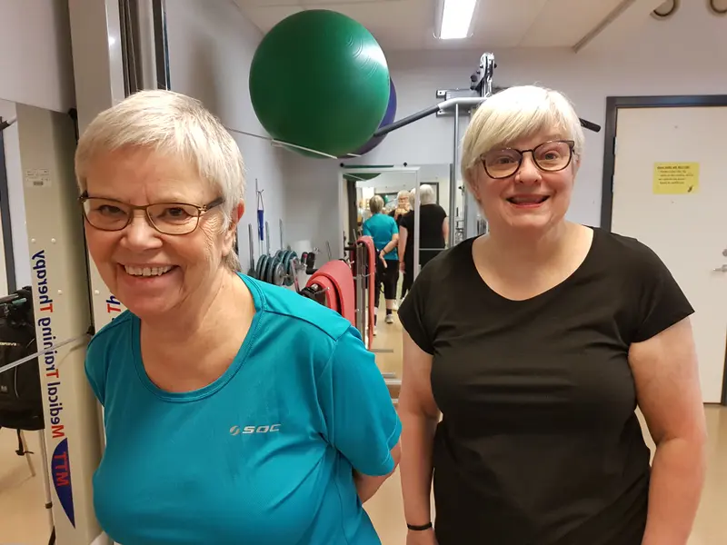 Nyopererade Björn, Ingegerd och Ann-Charlotte gläds åt sina nyligen inopererade nya konstgjorda knän och träningen av knän och andra kroppsdelar under den härliga och stimulerande tiden med effektiv träning på Bollmora VC under överinseende av sjukgymnasten Stefan Skoogh. Programmakare Gunnel Agrell Lundgren.