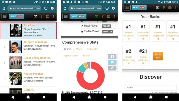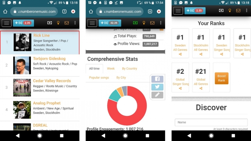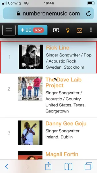 Här ser man (mobilbilder) rankingen på Ricks musik på www.numberonemusic.com och veckans topplista Top Songs på nätet.