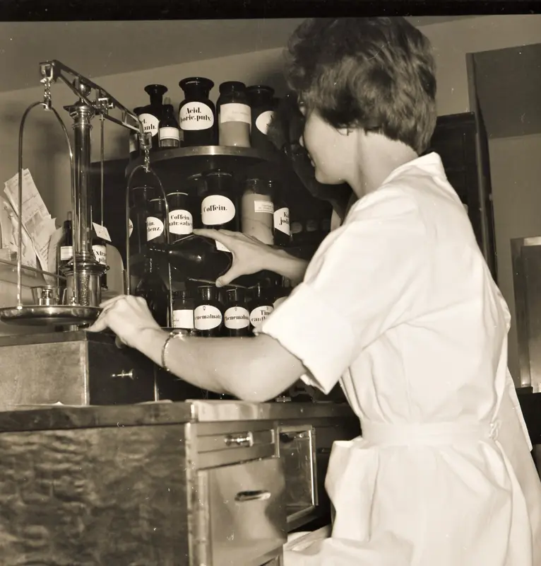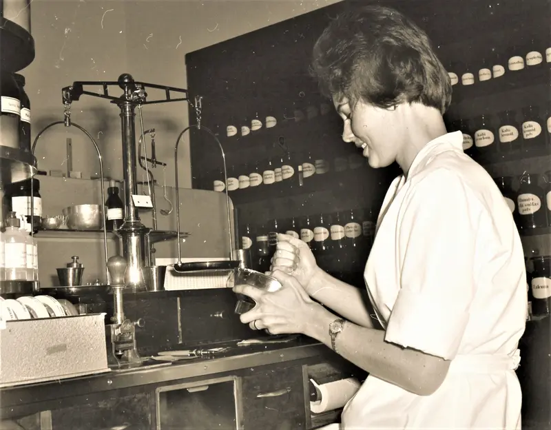 Gunnel vid recepturen där vi tillverkade de flesta av receptutskrivna läkemedel. På det ena gör hon en salva, dvs väger upp ingredienserna och rör ihop dem till en slät salva.