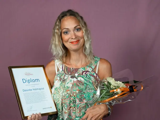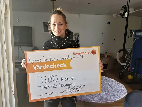 Kulturstipendiaten Désirée visar stolt upp sin check på 15 000 kr. Pengarna ska hon använda till en resa till utsatta barn i Colombia i oktober 2019.