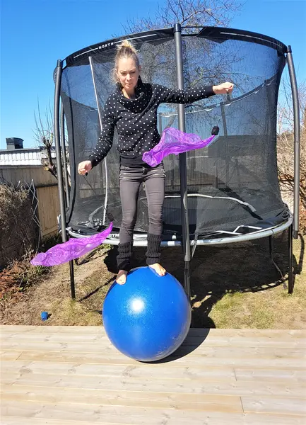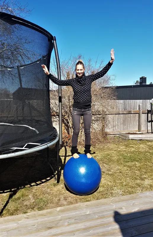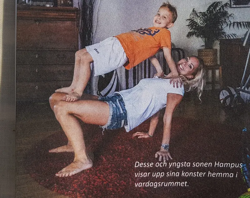 Désirée gör parakrobatik med sonen Hampus hemma i vardagsrummet. Foto Peter Eriksson KRUSBODAKONTAKT.