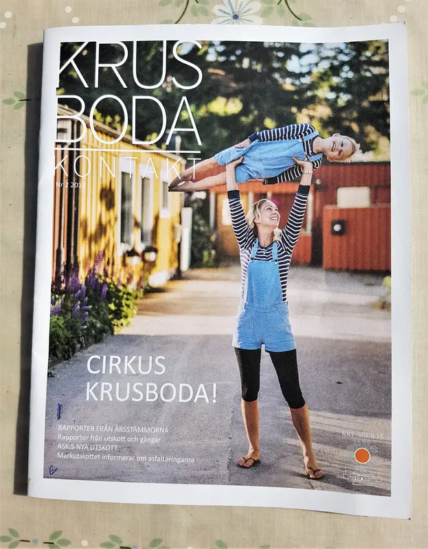 Framsidan på ett nr av tidningen KRUSBODAKONTAKT. Désirée balanserar sonen Hampus på sina uppsträckta armar hemma i Krusboda. Foto Peter Eriksson, Krusboda.
