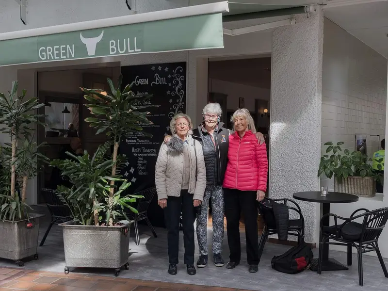 Gertrud Ternblad, Gunnel Agrell Lundgren och Ann-Cathrine Bergman framför entrén till Green Bull som tidigare var ingången till Apoteket Gladan.