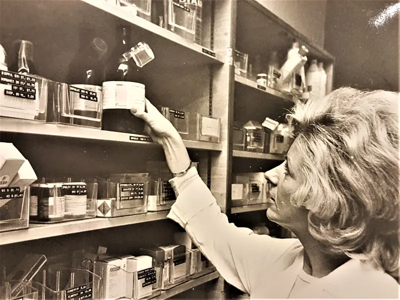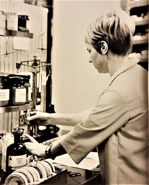Ann-Catrine väger upp läkemedel på balansvågen 1969