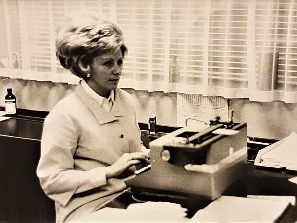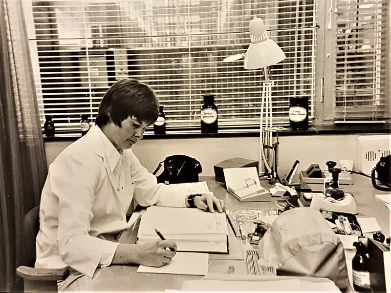 Gertrud skriver apoteksetiketten med doseringsanvisningen 1969