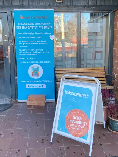 Skylten syns utanför dörren till Hälsoteamet Tyresö på Radiovägen 3