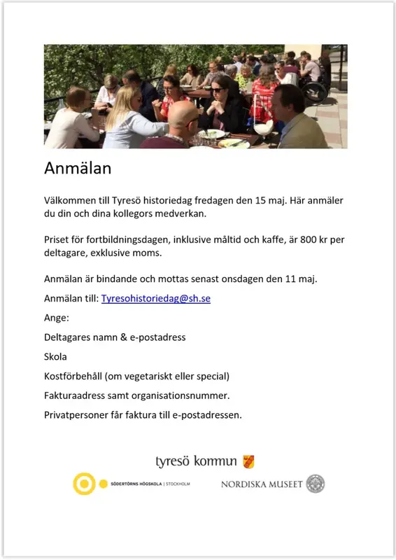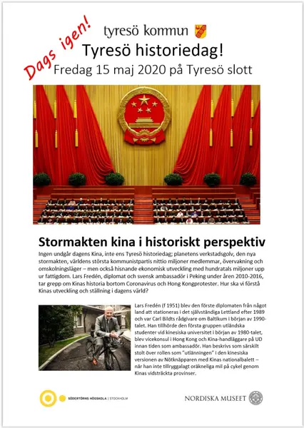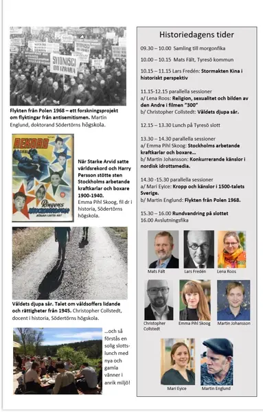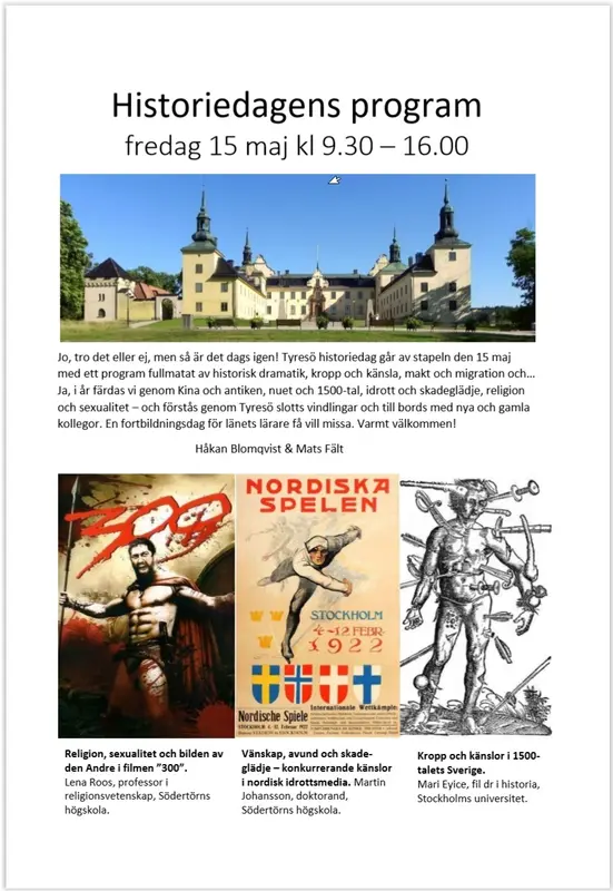 Fredagen den 15 maj skulle Tyresö kommun och Södertörns högskola bjuda in alla lärare och andra historieintresserade till en dag på slottet. Nu är denna dag uppskjuten till hösten. Mats Fält och Håkan Blomqvist berättar för Ann Sandin-Lindgren om det spännande programmet som alla är välkomna till. Anmälan till Tyresohistoriedag@sh.se Se mer info nedan.