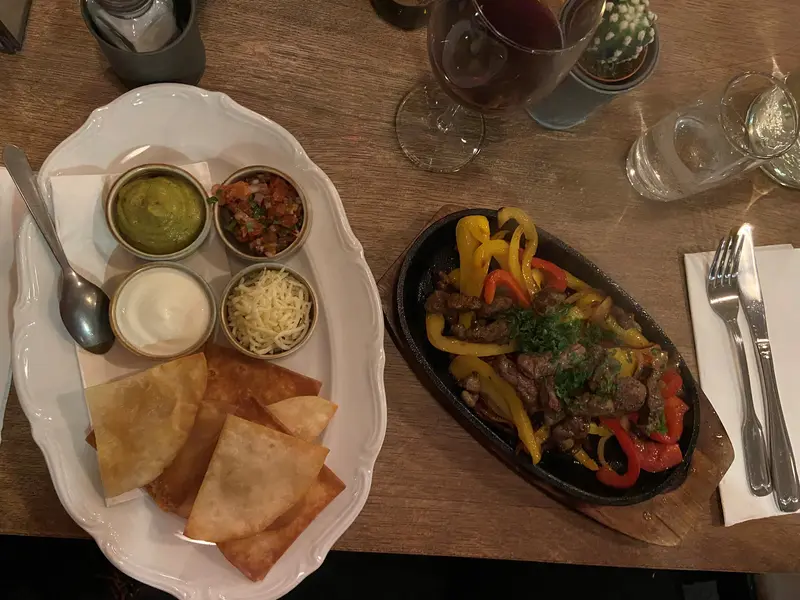 Catarina tog Ranchlands fajitas med lök, paprika, frirerad tortilla, pico de gallo, gräddfil, guacamole och riven mozarella