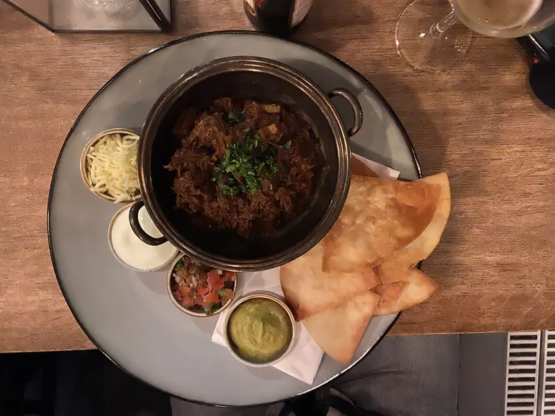Bosse tog No bean chili med högrev med friterad tortilla, pico de gallo, gräddfil, guacamole och riven mozzarella