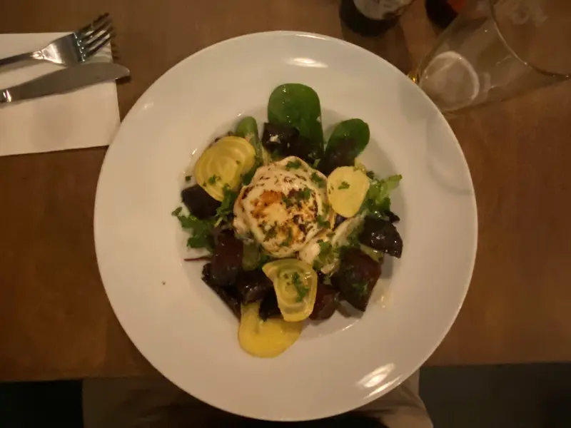 Leif tog en vegetarisk Honungsgratinerad "chèvre chaud" på toast med örtbakad rödbeta, picklad gulbeta och rostade solrosfrön.