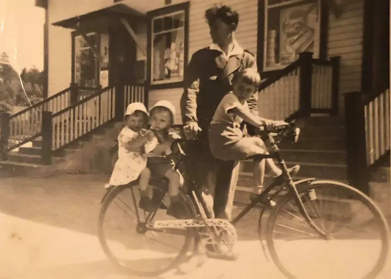 Familjen Malmsäter framför Erlandsons affär vid Skogsängsvägen. Trapporna var ingång till affären. Den vänstra trappan på bilden är ingången till kött och den andra var till specerier och den tredje var mjölk.