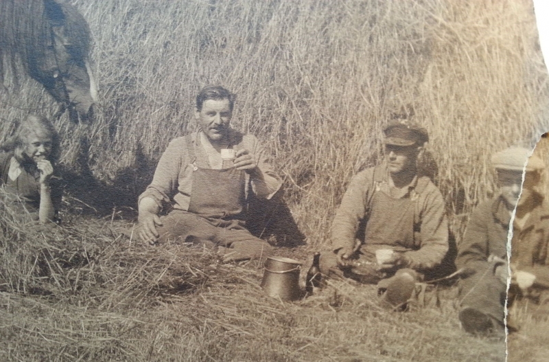 Höbärgning på Listudden vid Flaten. Från vänster farfar Gunnar Karlsson, drängen Evert Karlsson, Gullans blivande man född 1908, och Folke som var Gullans 2 år yngre bror.