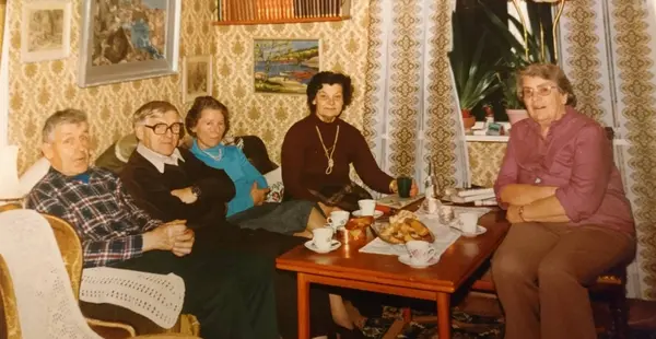 Gullan (längst till höger) ca 75 år i vardagsrummet. Kusinmöte.