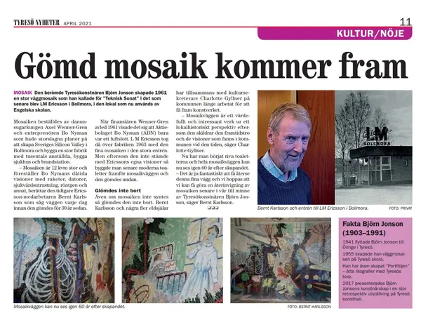 Bernt Karlsson och några eldsjälar har i många år jobbat för att Björn Jonsons vackra mosaikvägg som har varit gömd i gamla LM Ericssons lokaler ska få komma fram. Nu har man börja riva toaletterna som döljer väggen. Bernt berättar för Ann Sandin-Lindgren om historien bakom konstverket; om Wenner-Gren, ABN och om deras stora planer.