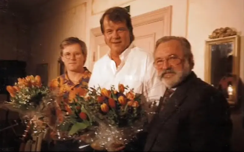 Bild från filmen där ordförande Georg Ramqvist i Kumla herrgårds bygdegårdsförening tackar den tidigare Tyresöbon Lasse Berghagen vid ett uppträdande