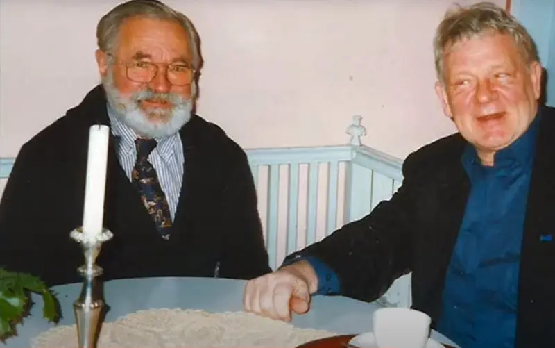 Bild från filmen där ordförande Georg Ramqvist i Kumla herrgårds bygdegårdsförening samtalar med Börje Ahlstedt