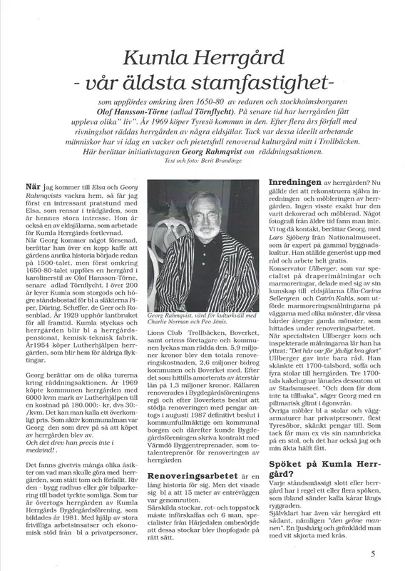 En arkivpärla från 1996 då Åke Sandin intervjuar Trollbäckenprofilerna Georg (1927-2005) och Elsa (f. 1930) Rahmqvist som betytt mycket för Tyresö. De har båda varit aktiva i många föreningar och kämpat för att Kumla Herrgård skulle överleva. Georg var även med och startade Trollbäckens Tennisklubb.