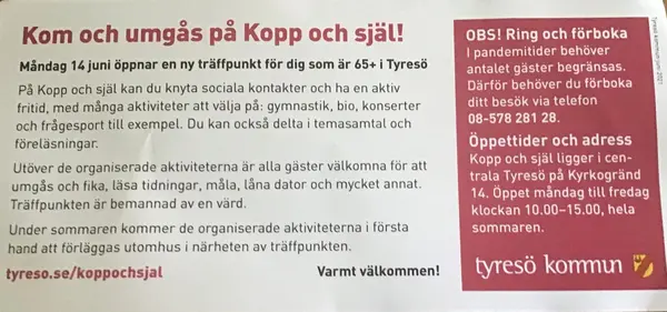 "Kopp och själ" heter Tyresös första träffpunkt för 65+ vid Bollmoradalens kyrka. Den är öppen hela sommaren vardagar 10-15. Tyresöradions Ann Sandin-Lindgren var på plats vid invigningen den 8 juni och fick höra vad politiker, personal och alla engagerade äldre tyckte. Tal av bla. Anita Mattsson som tillsammans med Maj-Britt Ekstrand klippte bandet.