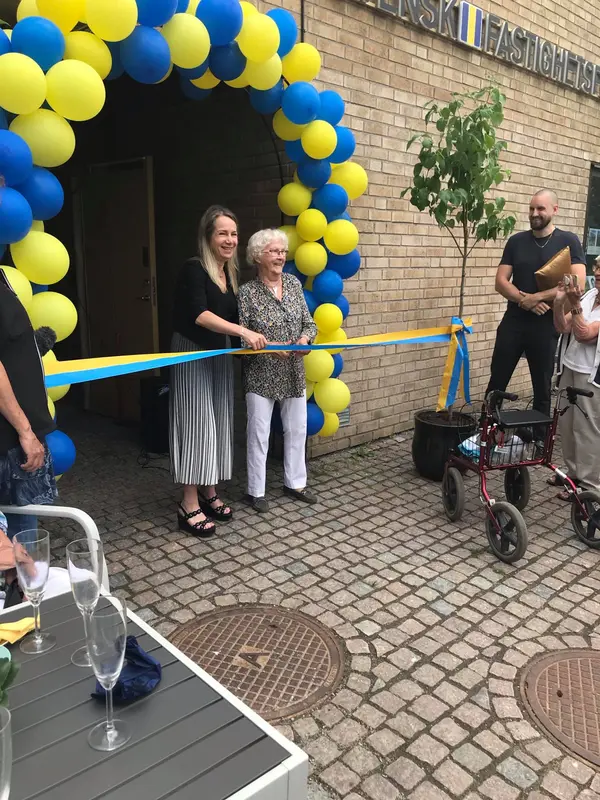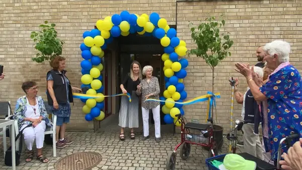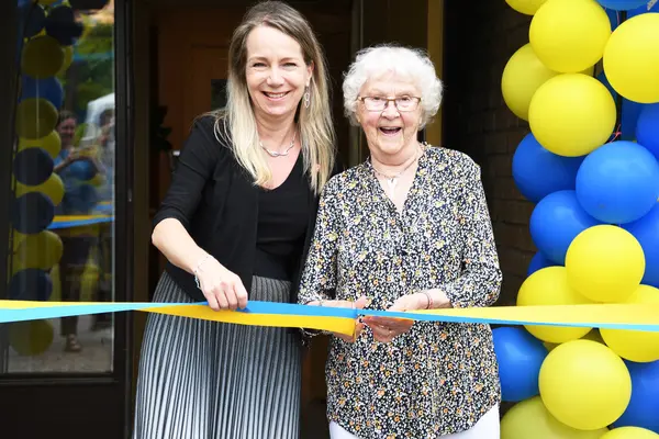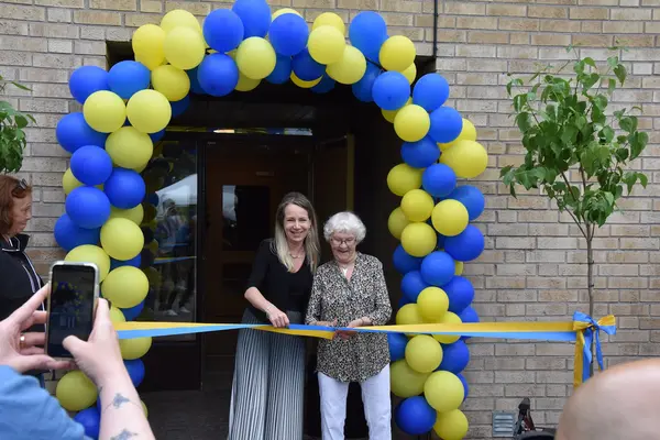 Kommunstyrelsens ordförande Anita Mattsson klipper bandet med Maj-Britt Ekstrand 96 år