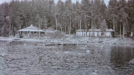 Till vänster anas Åke Ringström hus på kullen där torpet Borgen /Kumla Borg låg och man kan ana lutvattnet i sjön vid Hästryggen från Sjögrens tvätt.