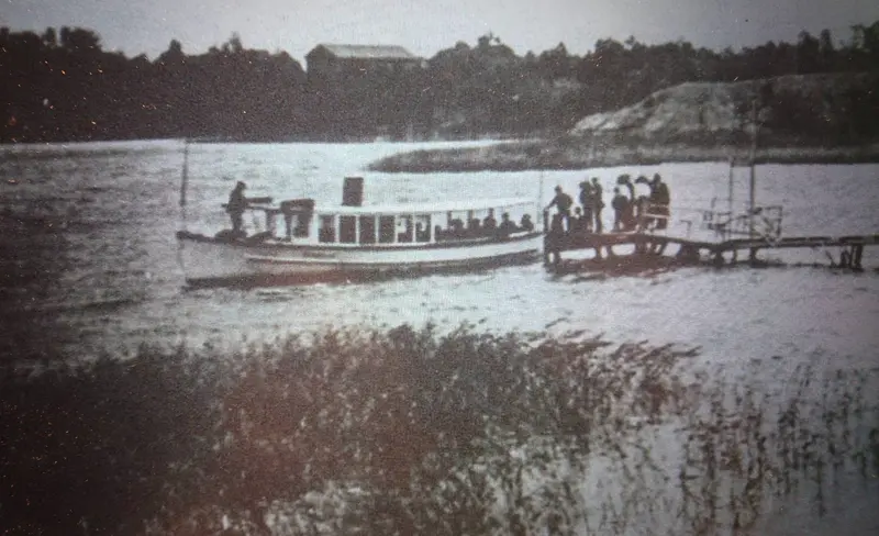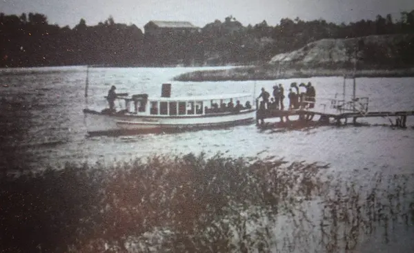 Ångslup på Drevviken vid Dalens brygga vid Vendelsö. Bakom syns badberget "Flodhästen/Krokodilen".