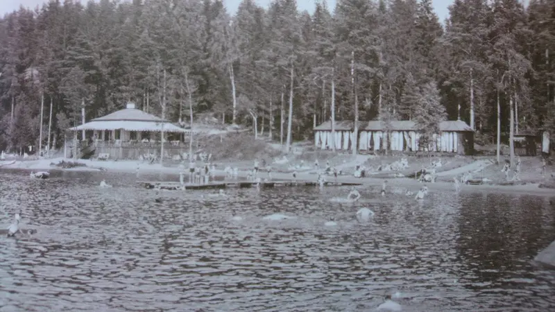 Skrubba Sand på 40-talet med servering och badbrygga.