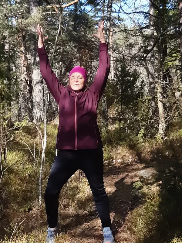 Vi promenerar i tystnad i skogsterräng och stannar flera gånger för att göra yogaövningar stående både fysiska och lugna rörelser. Det behövs ingen yogamatta utan hela yogapromenaden är gående/stående. Yoga med fokus på Andning som ger inre lugn, minskad stress och balans i vardagen.