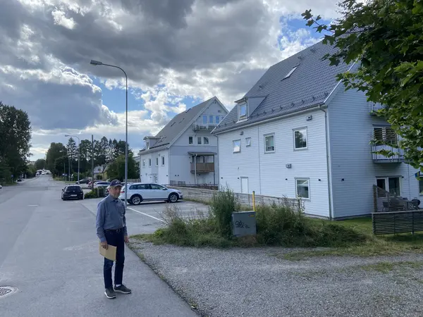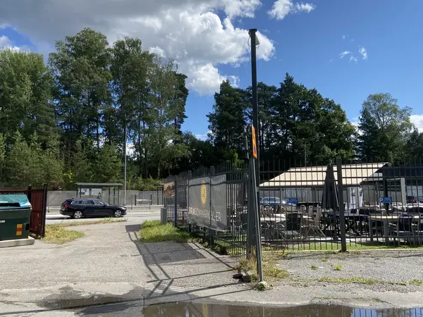 Busskiosken anas längst till vänster. Ett litet mörkt hus.