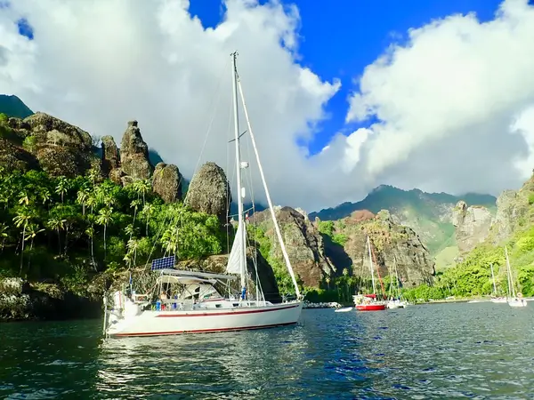 En av de mest dramatiska ankringsvikarna vi besökt. Hanavave på Fatu Hiva, Franska Polynesien.