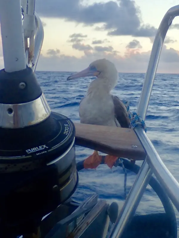 Besök av en havssula på överfarten Stilla Havet. De vilar ut på båten något dygn innan de flyger vidare.