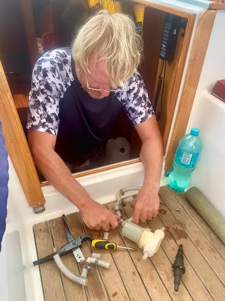 Jonas mekar med vår watermaker som gått sönder på överfart i Stilla havet