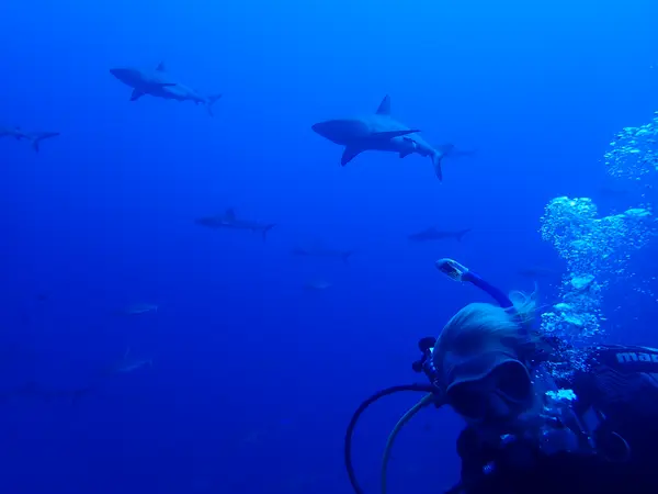 Jonas dyker med hajar, sydpasset, Fakarava, Franska Polynesien.