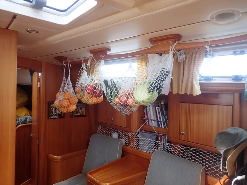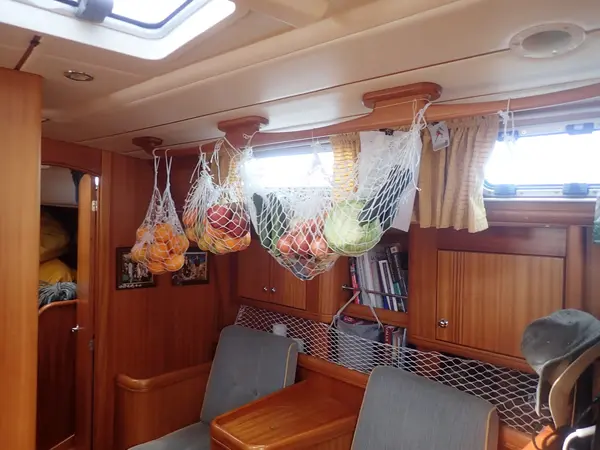 Grönsaker och frukt för 3 veckors segling över Atlanten hänger luftigt i båten