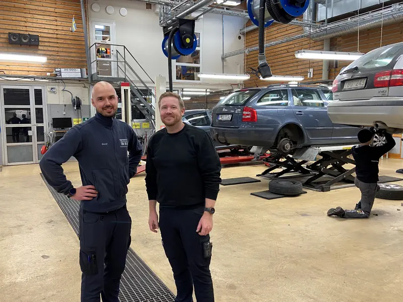 Två av lärarna Oscar Eriksson och Fredrik Axrud i den stora hallen där eleverna får jobba med kundbilar. De andra lärarna på Fordonsprogrammet är Carl Cederquist och Peter Wiborg.