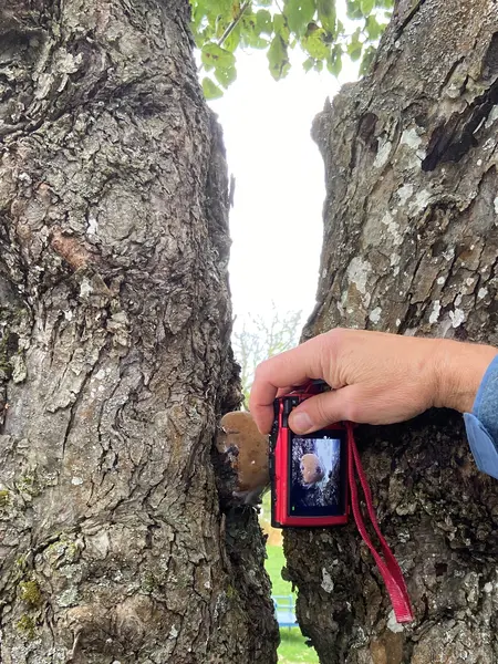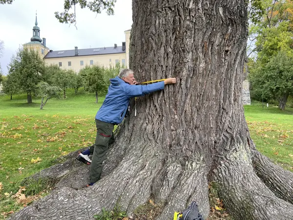 Här mäter vi upp hur stor omkrets den stora eken i slottsparken har, ett s.k. jätteträd. 7,05 m.