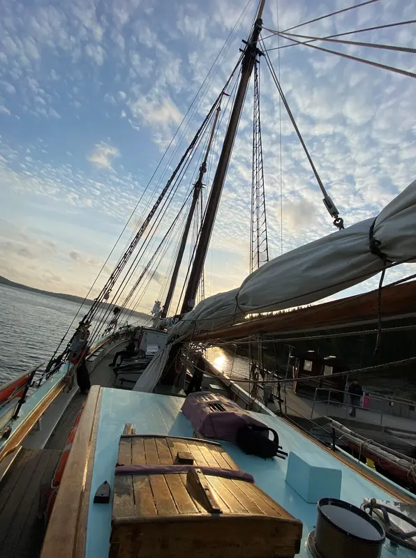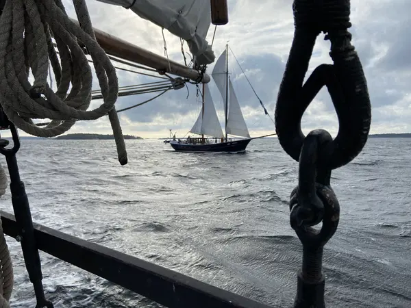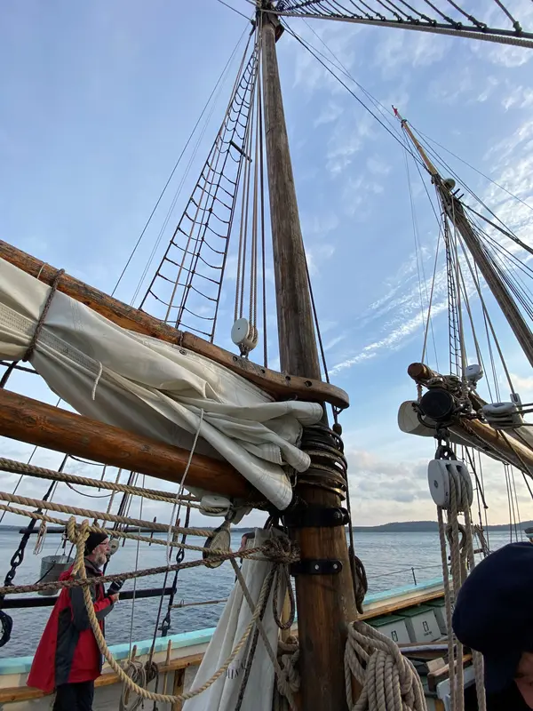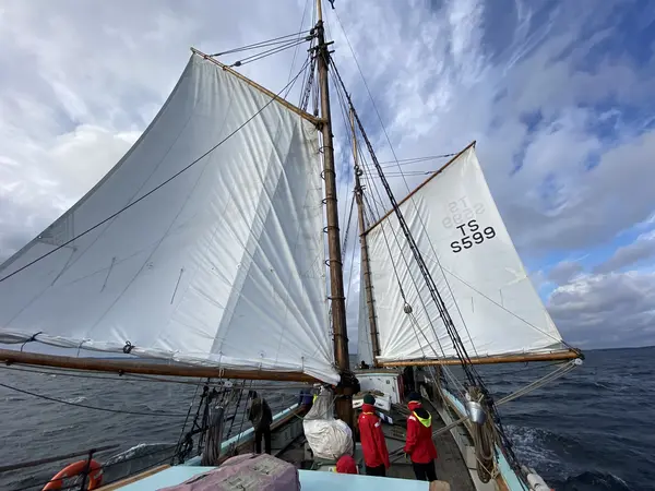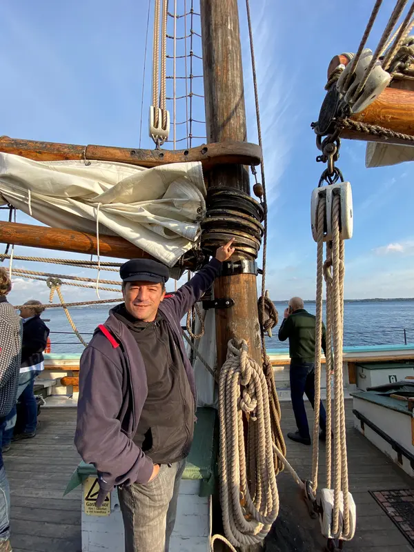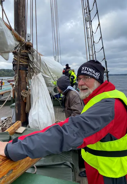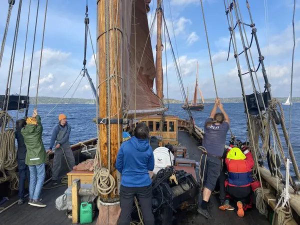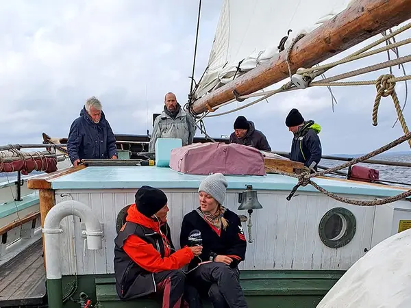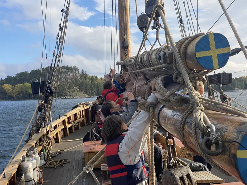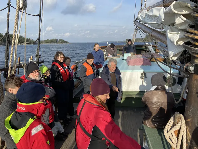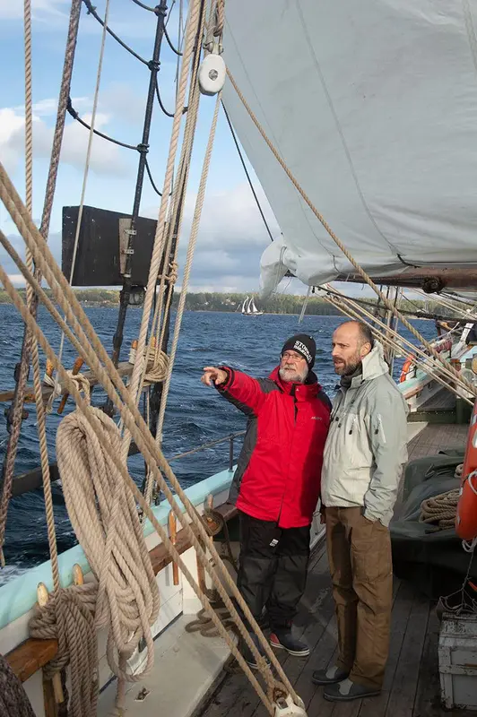Den gamla ägaren till Constantia, Hakon Malmborg, håller kurs om hur seglen ska hissas och hur man på rätt sätt skotar de tunga seglen.