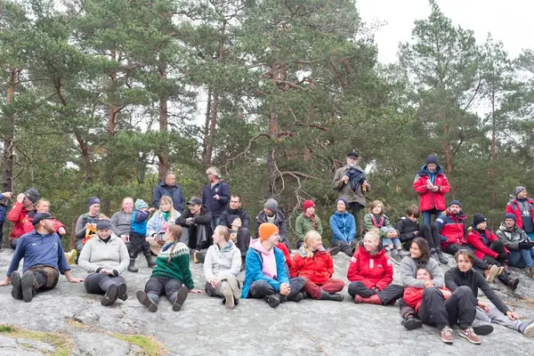 Hela gänget samlas på klipporna på Ängnö inför prisutdelning.